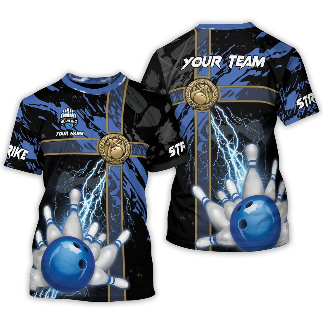 Custom Black And Blue Team Bowling T Shirt For Men, Custom Bowling Team Shirts BT0014