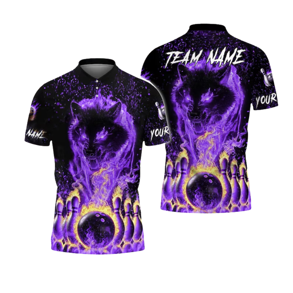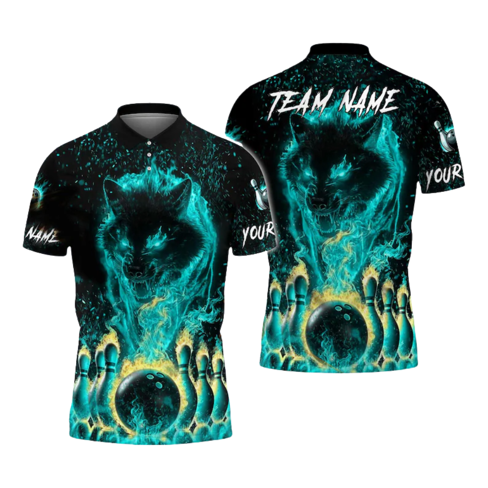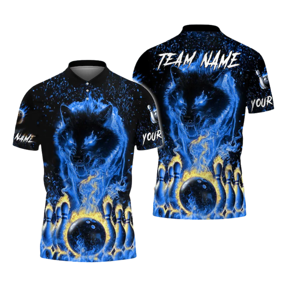 Custom Blue Flame Wolf Bowling Polo Shirt For Men, Custom Wolf Bowling Team Shirts BE0061