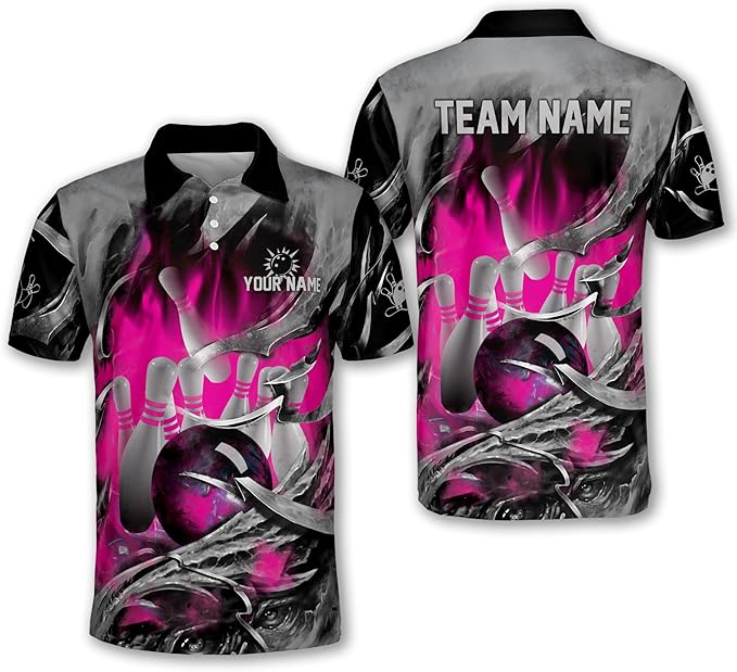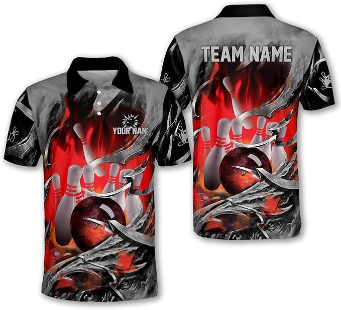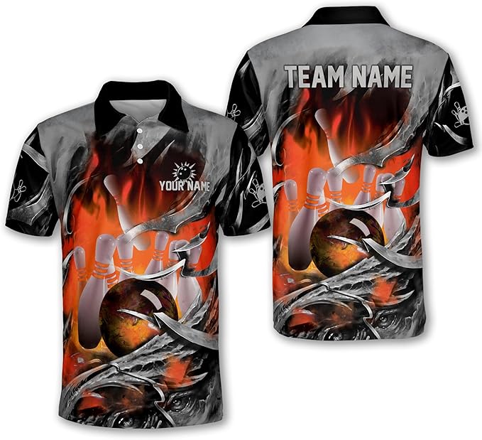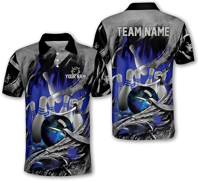 Custom Blue Flame Bowling Polo Shirt For Men, Custom Team Flame Bowling Shirt BM0286