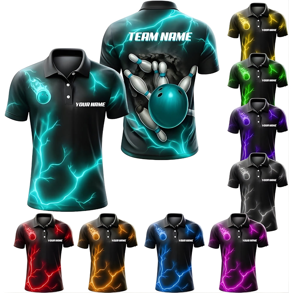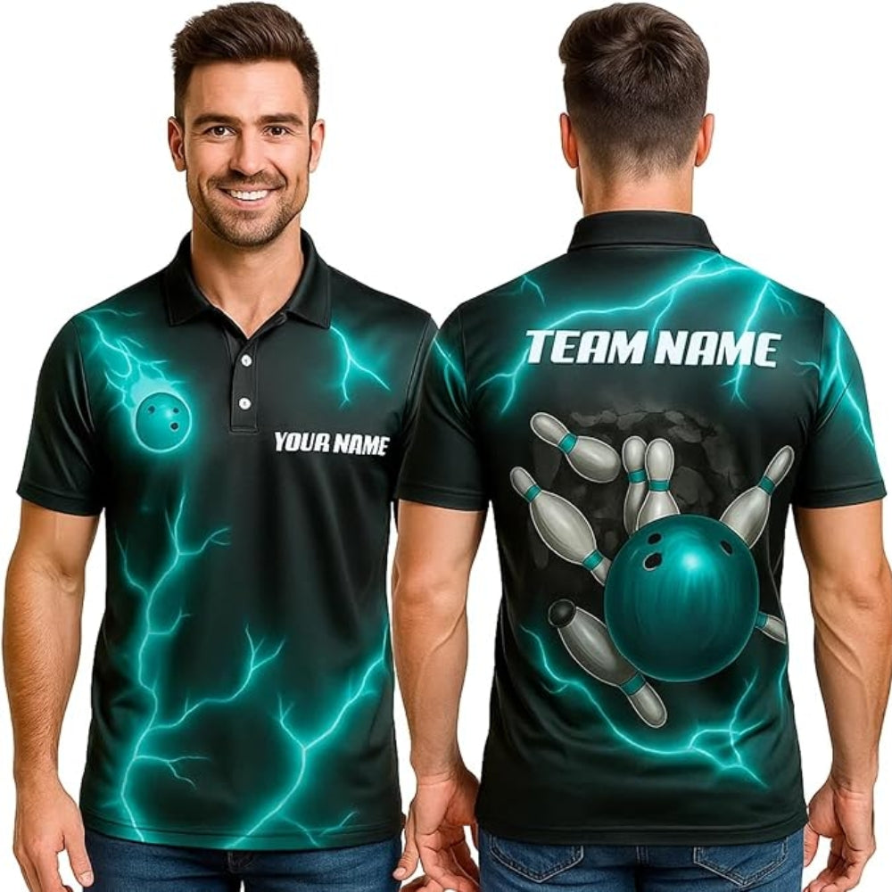 Custom Cyan Thunder Lightning Bowling Men Polo Shirt, Custom Bowling Team Shirts BZ0336