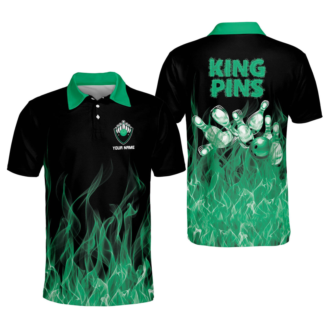 Custom Green Flame Bowling Polo Shirt For Men, Custom King Pins Funny Flame Bowling Shirt BM0234