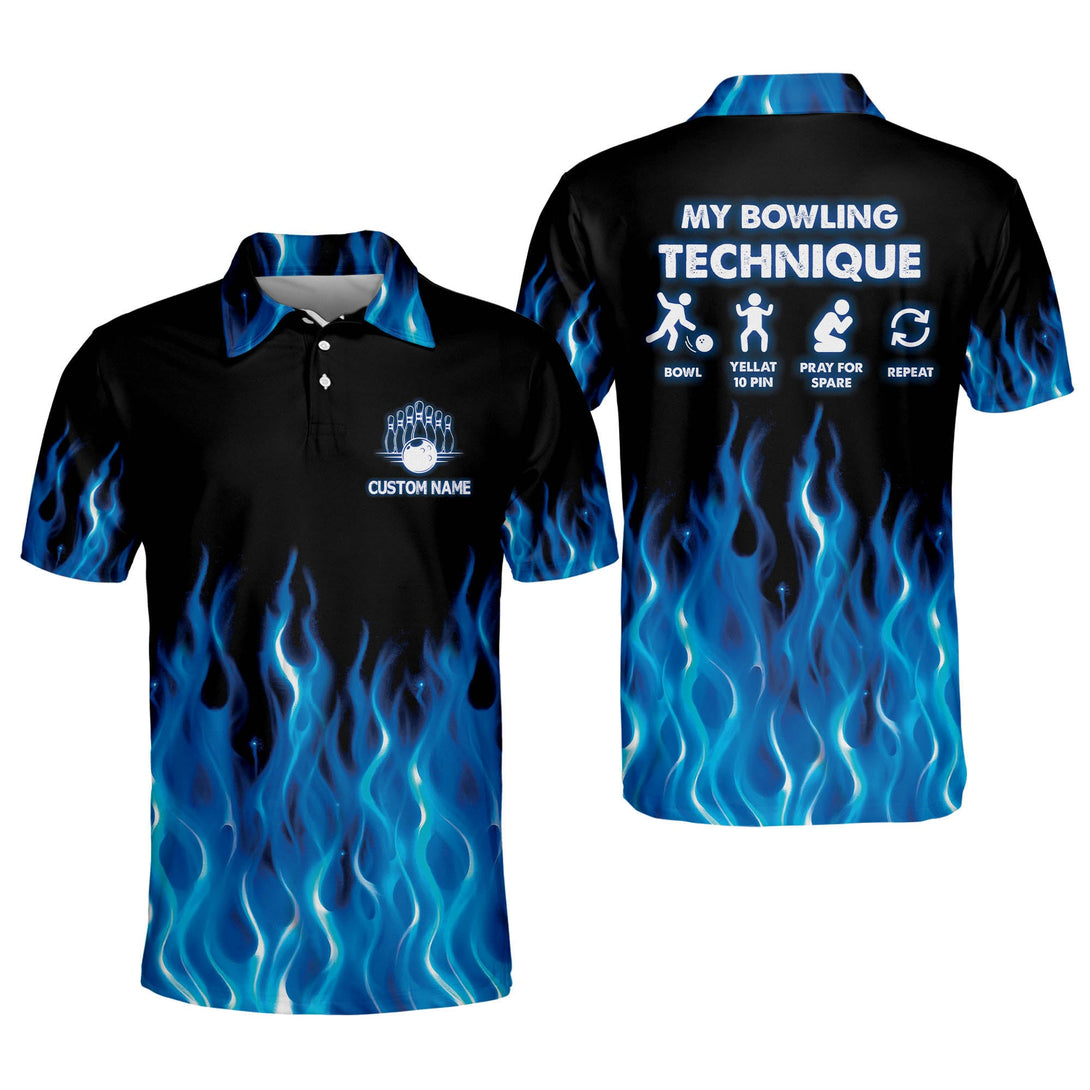Custom My Bowling Technique Blue Flame Bowling Polo Shirt For Men, Custom Flame Bowling Shirt Funny BM0019