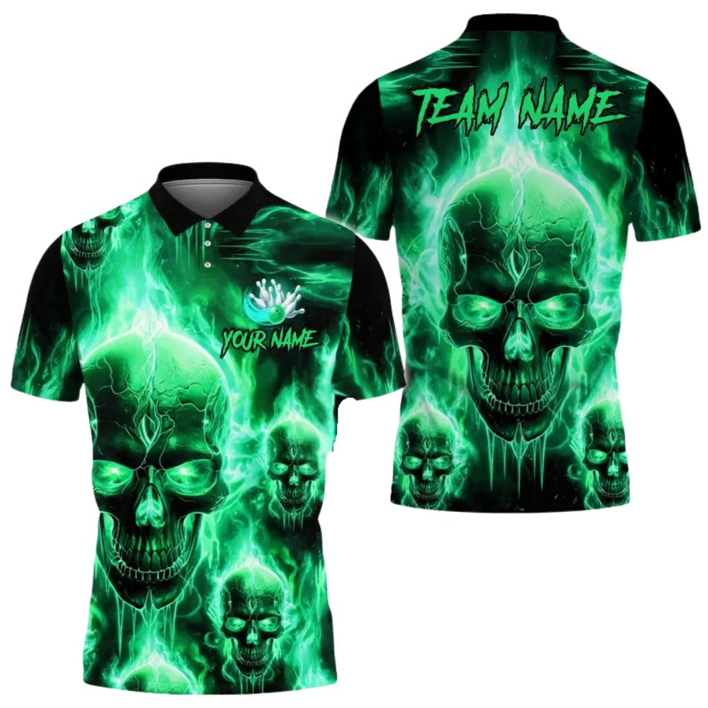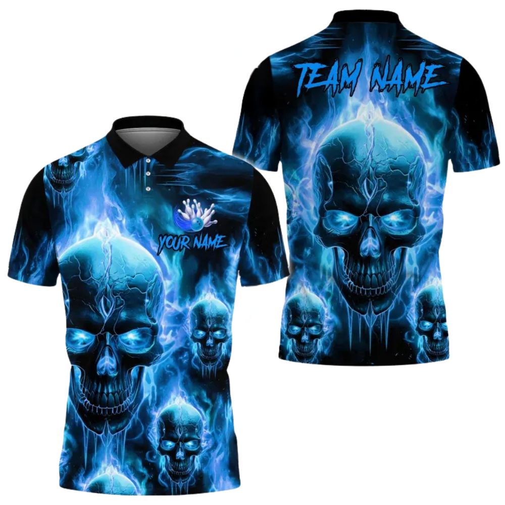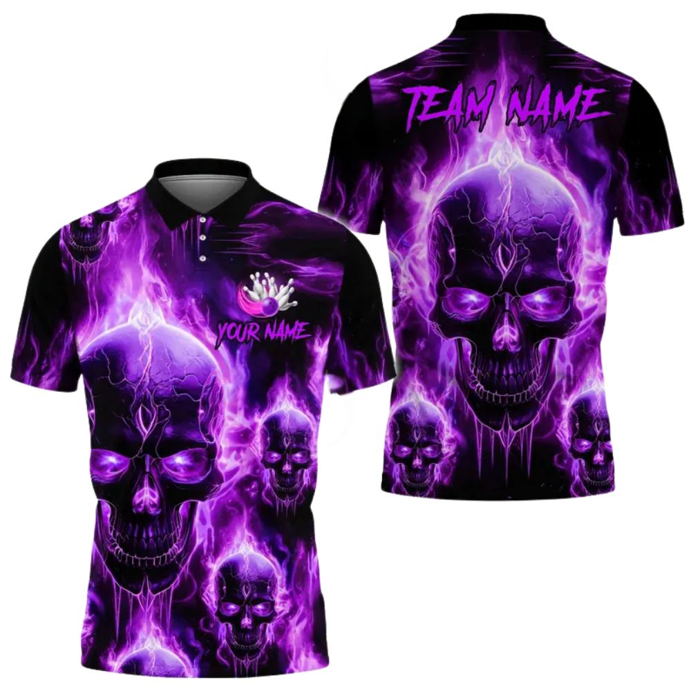Custom Purple Skull Bowling Men Polo Shirt, Custom Flame Skull Bowling Team Shirts BE0110