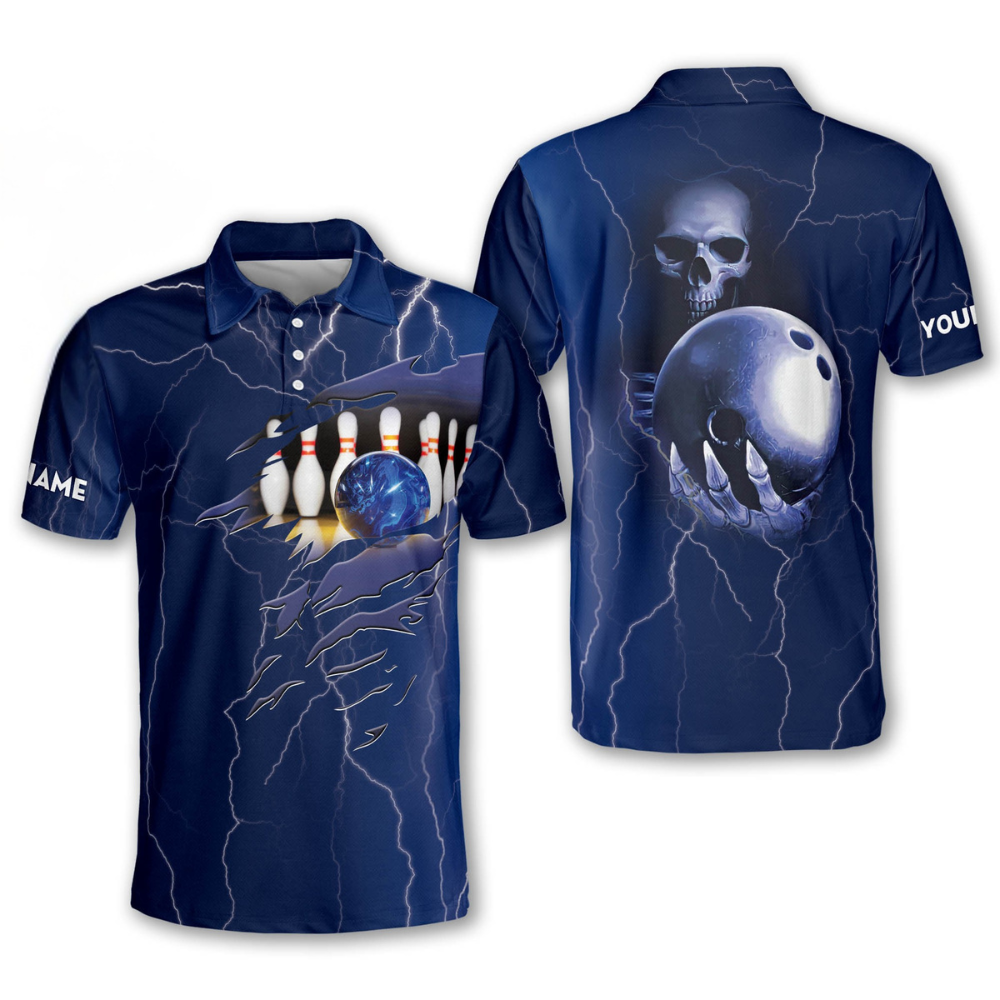 Custom Skull Bowling Polo Shirt For Men, Custom Skull Blue Bowling Shirt BM0295