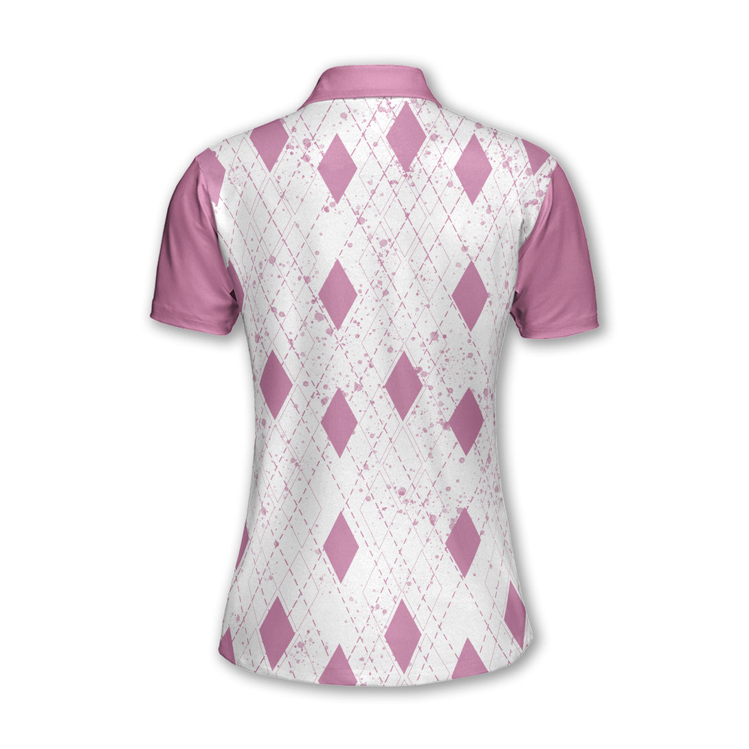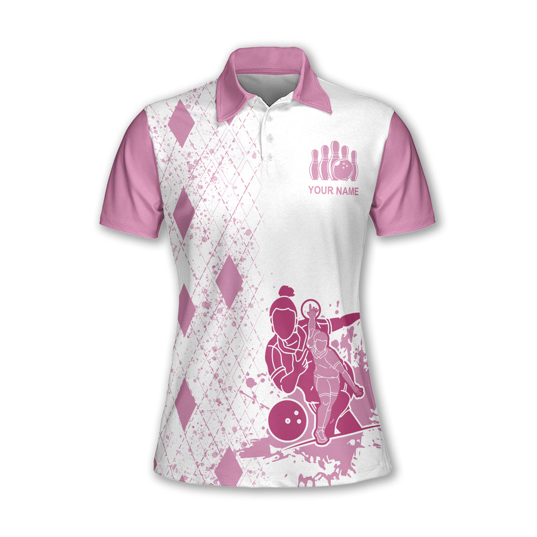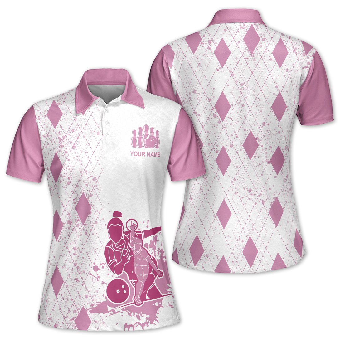 Custom Ladies Bowling Shirts, Custom White And Pink Argyle Bowling Polo Shirt For Women BZ0105