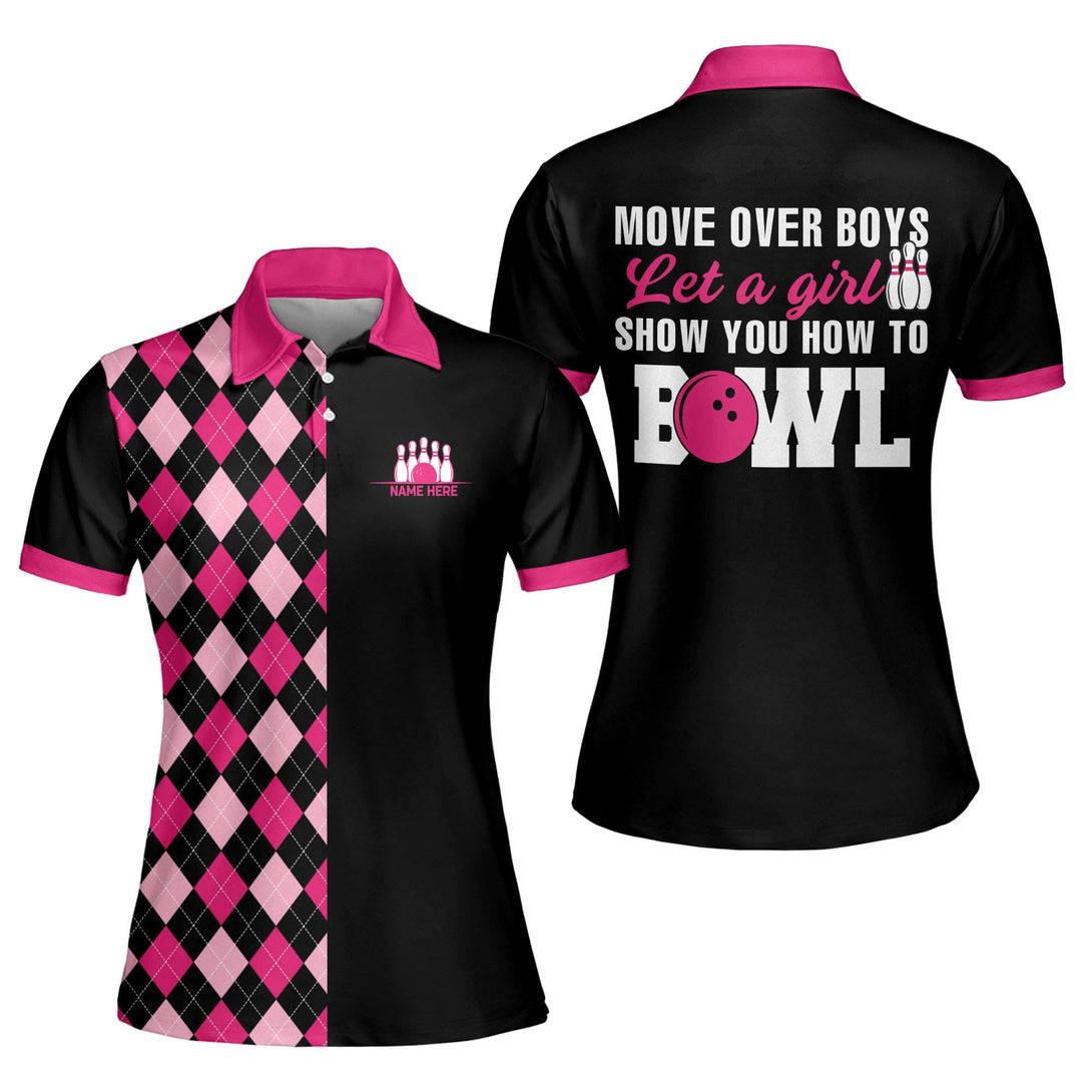 Custom Move Over Boys Let A Girl Show You How To Bowl Bowling Polo Shirt For Women, Custom Black And Pink Funny Bowling Shirt Womens BW0067