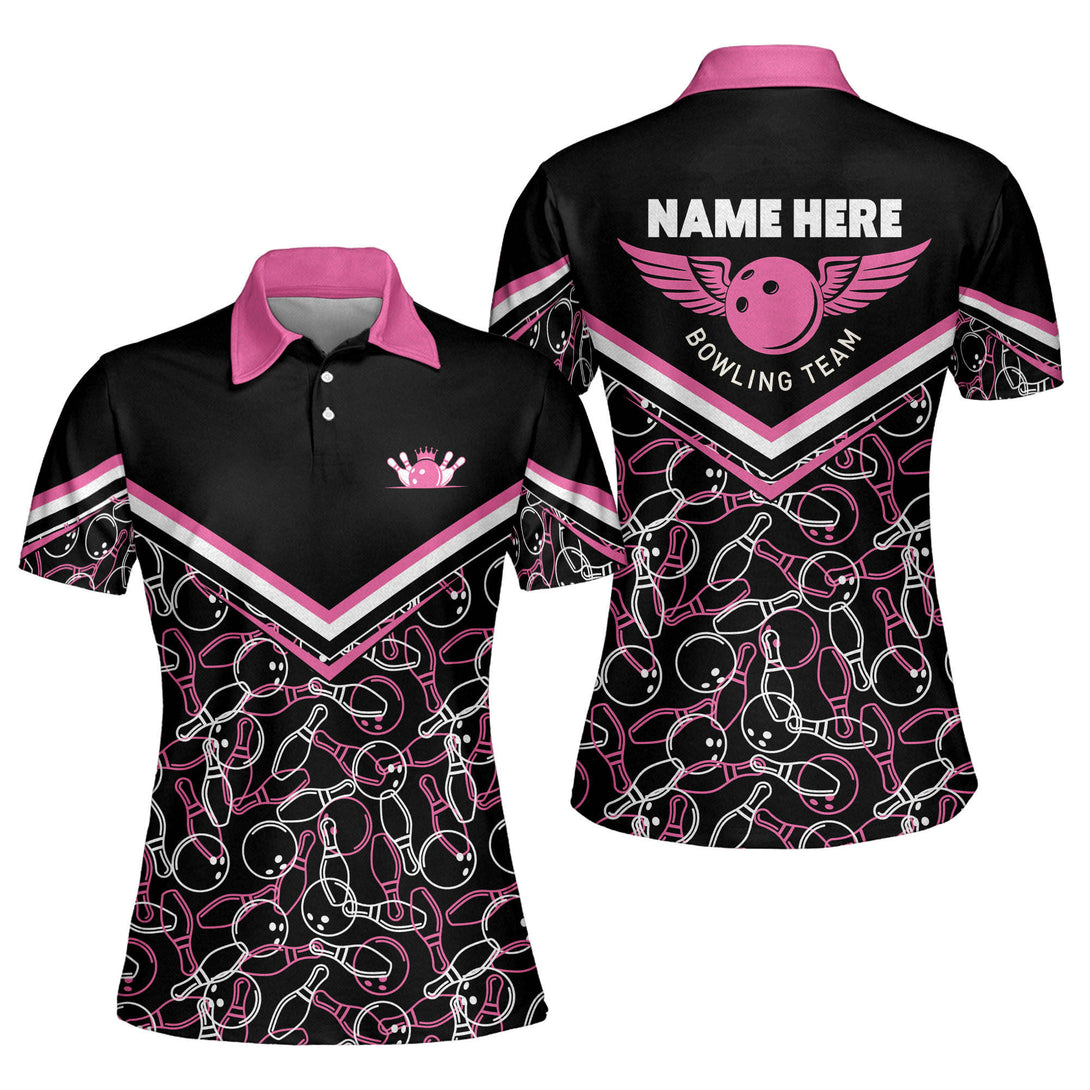 Custom Women Bowling Shirt, Custom Black And Pink Team Bowling Polo Shirt For Women BW0040