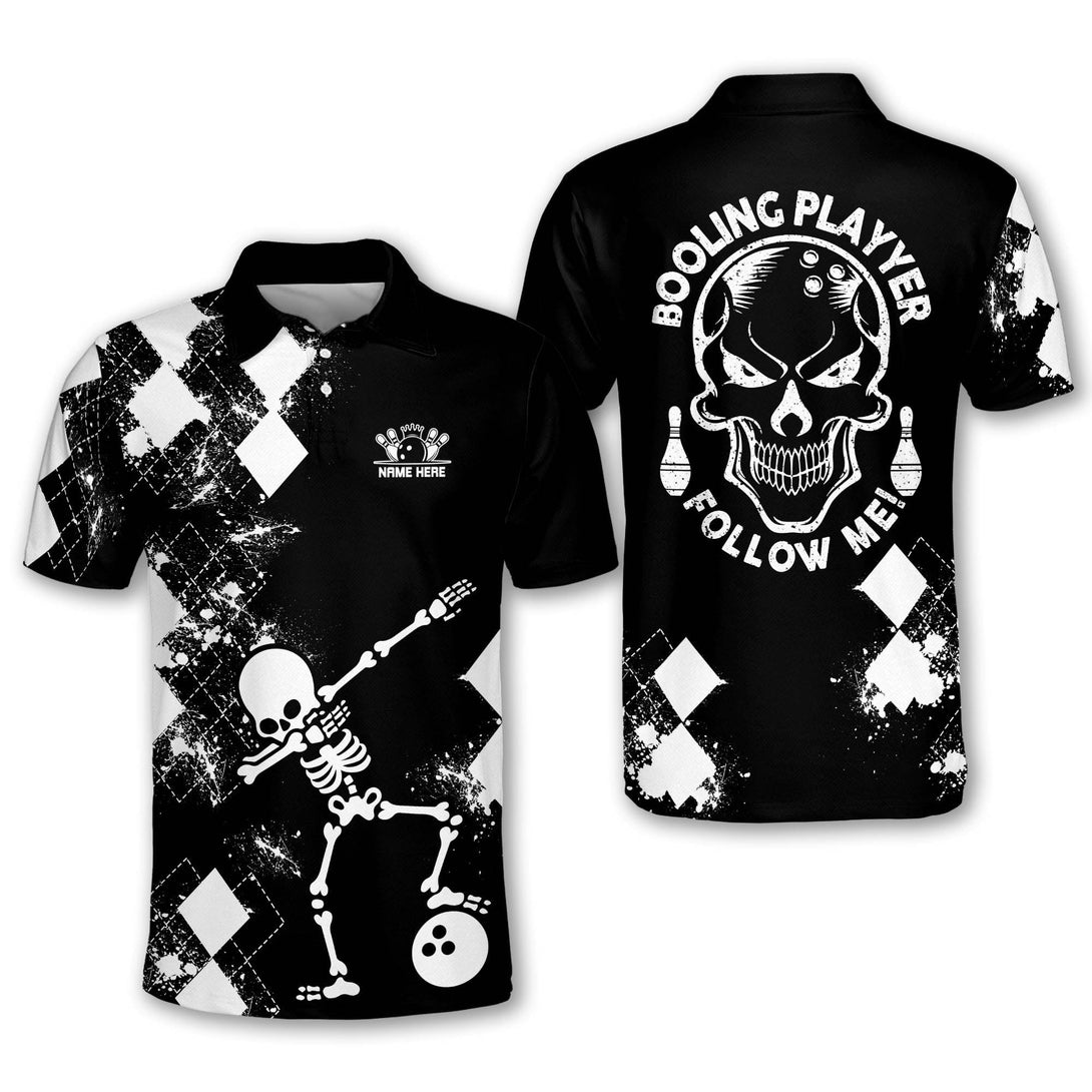 Custom Booling Playyer Follow Me Skull Bowling Polo Shirt For Men, Custom Black And White Skull Bowling Shirt BM0140